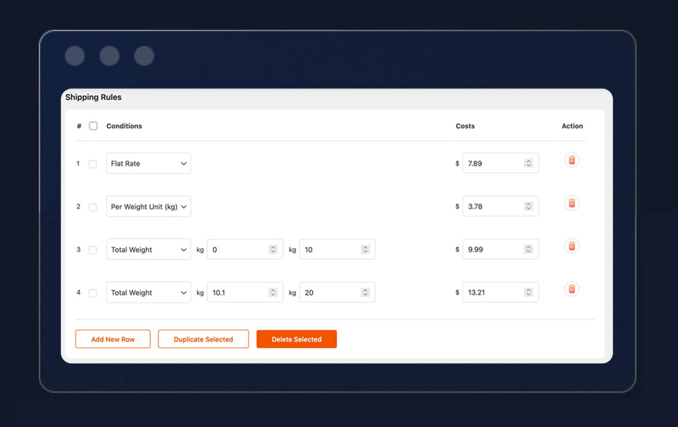 • Weight-based rulesets for precision pricing: Use unit weight or weight ranges to charge fairly and optimize profit margins.