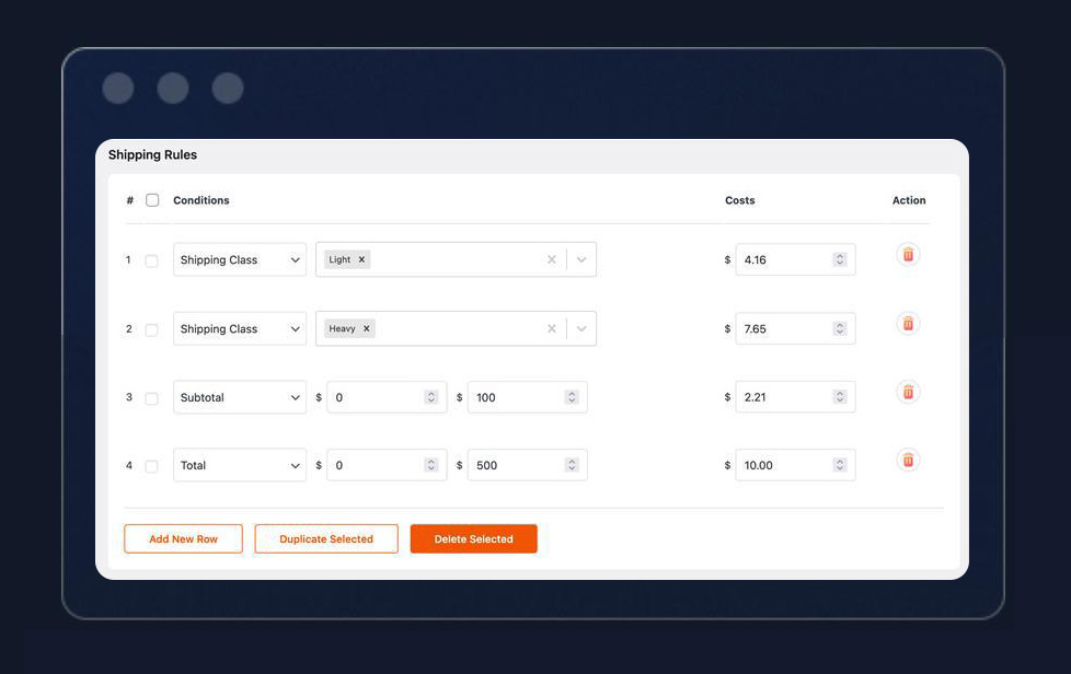• Assign classes for streamlined rules: Set specific rates and delivery speeds for fragile items, bulk orders, or oversized goods with ease.